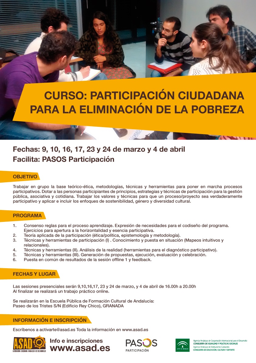 Toda la información en: http://asad.es/curso-participacion-ciudadana-para-la-eliminacion-de-la-pobreza/