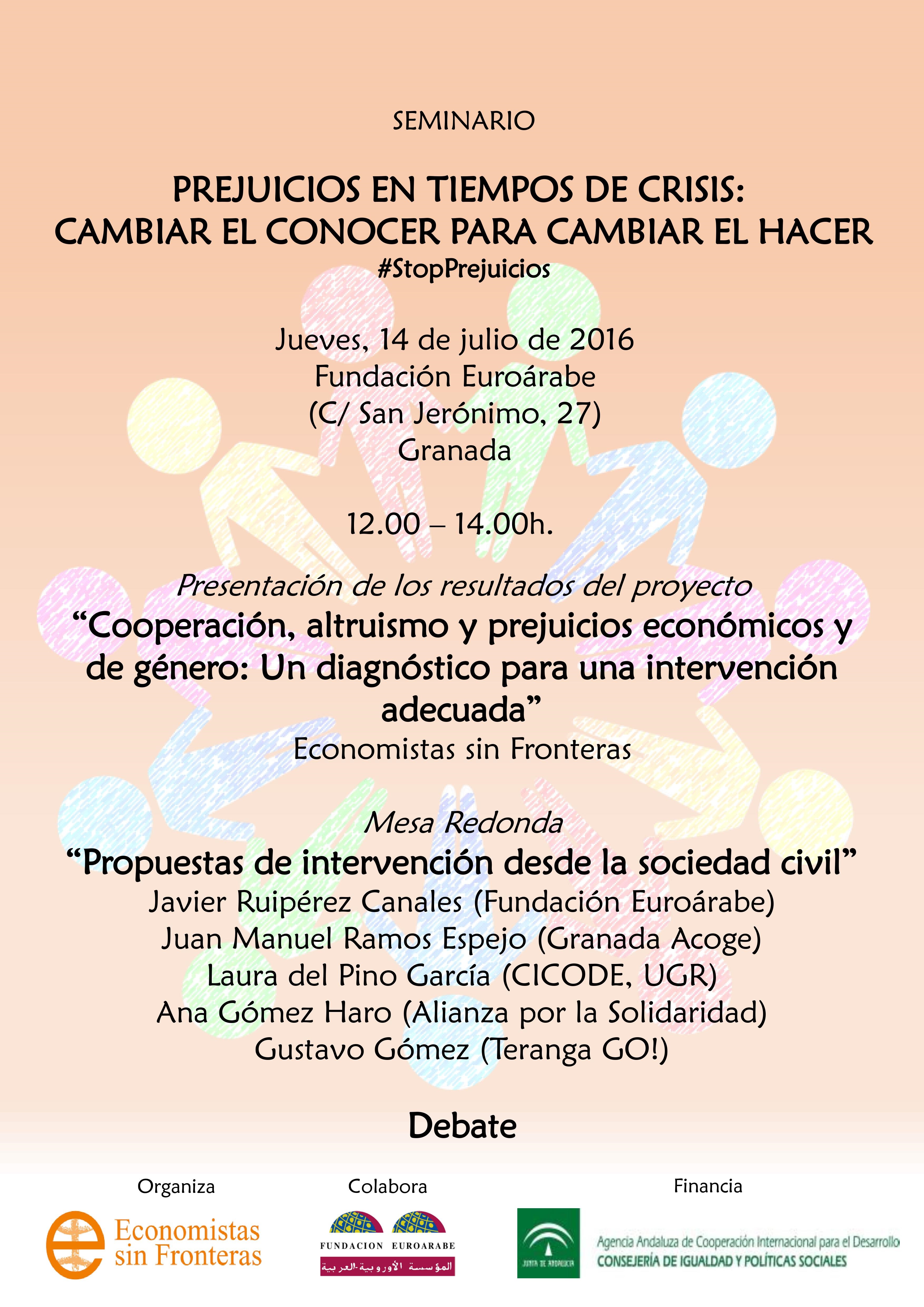 Ante estos sucesos surge la cuestión de qué está ocurriendo en las sociedades de acogida con los prejuicios de la población local hacia etnias minoritarias y si el nivel de prejuicios tiene relación con comportamientos igualitarios, altruistas o egoístas ante dichas minorías. Con la intención de responder a esta pregunta, en este seminario se presentarán los resultados principales del diagnóstico “Cooperación, altruismo, prejuicios económicos y de género”, realizado por Economistas sin Fronteras en el marco de un proyecto subvencionado por la Agencia Andaluza de Cooperación Internacional para el Desarrollo.
