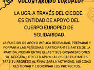 La UGR, a través del Centro de Iniciativas de Cooperación al Desarrollo (CICODE), es entidad de apoyo del Cuerpo Europeo de Solidaridad. La función de apoyo implica respaldar, preparar y formar a las personas participantes antes de la partida, mediar entre ellas y sus organizaciones de acogida, ofrecer apoyo a los participantes tras su regreso al finalizar la actividad, así como gestionar y coordinar los proyectos, para voluntariados individuales transfronterizos. Puedes contactar con el CICODE a través de admoncicode@ugr.es