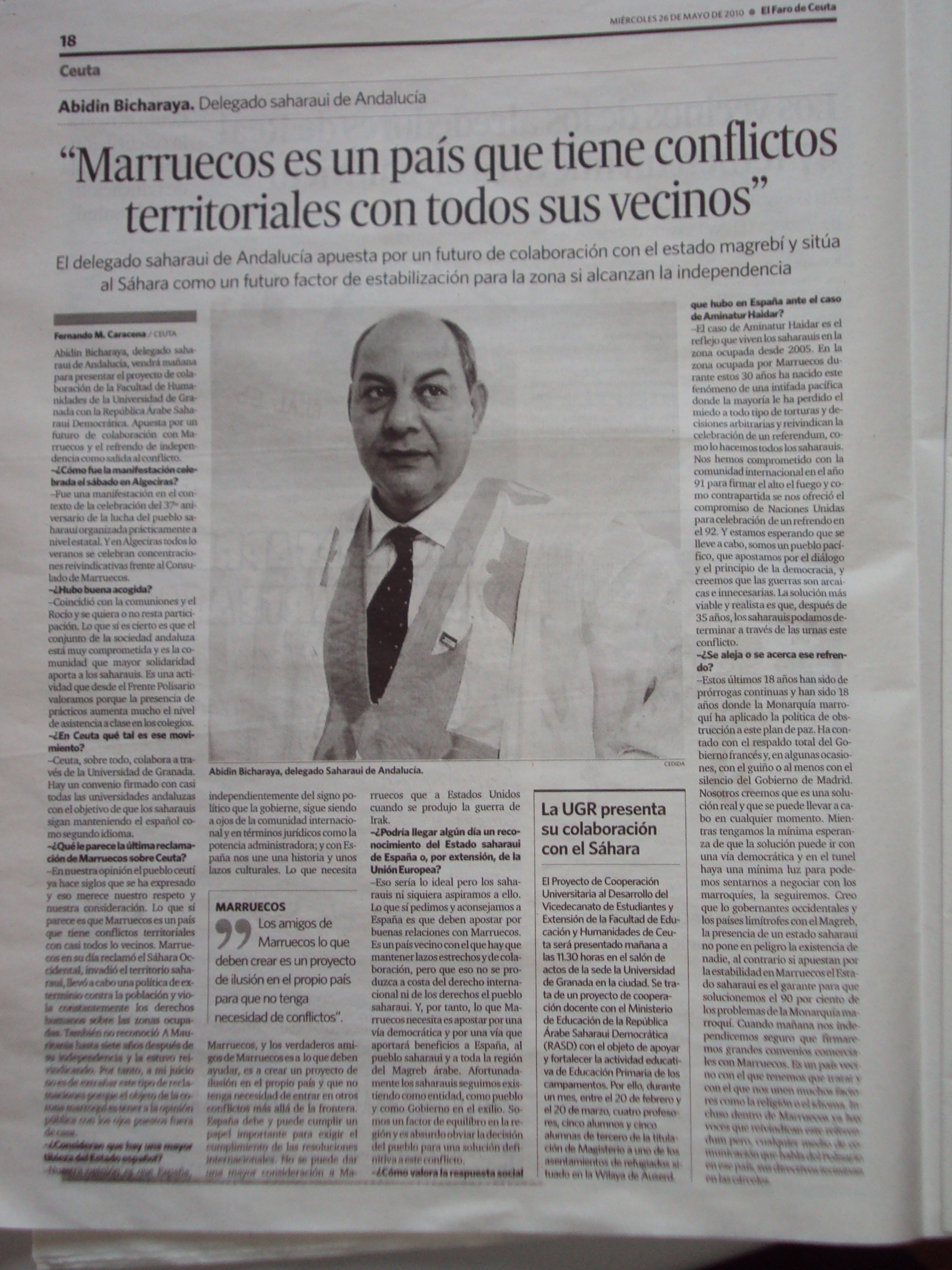 Acto oficial de presentación de resultados, experiencias e imágenes del proyecto, el día 27 de mayo a las 11:30 horas, en el Salón de Actos de la Facultad, que contó con la presencia del Delegado Saharaui de Andalucía.