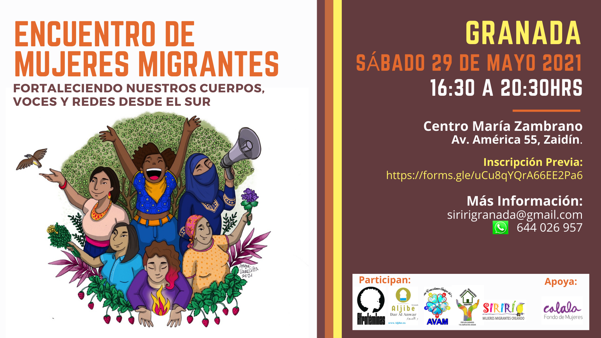 Participaremos referentes de: Afroféminas, Asociación Aljibe-Dar Al Anwar, Avam Asoc , Asoc. “Nosotras Granada” y Colectivo Sirirí.