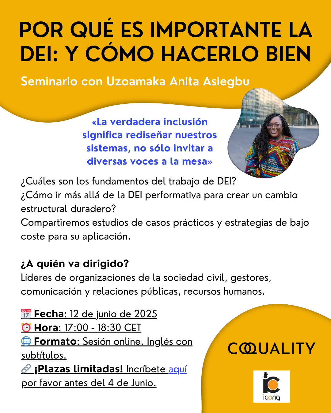 Ahí es donde entra en juego CoQuality. Somos una red colaborativa de ONG unidas para promover la calidad en el sector social a través del aprendizaje compartido, herramientas y estrategias viables. La DEI es el núcleo de la calidad, porque la inclusión impulsa el impacto, y el impacto es la forma en que combatimos la división. Participa en este seminario para explorar cómo incorporar la DEI en tu organización, asegurándo que tus equipos y servicios reflejan la dignidad y los derechos de todas las personas.