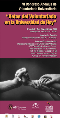 La Universidad de Granada y la Junta de Andalucía, a través de la Agencia Andaluza del Voluntariado, organizan en colaboración con las Universidades Andaluzas el VI Congreso Andaluz de Voluntariado Universitario que tendrá lugar en la Universidad de Granada los días 6 y 7 de noviembre de 2008.